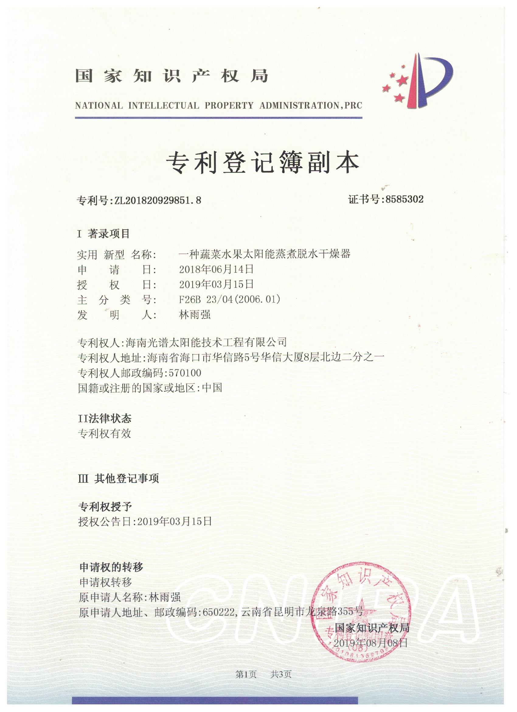 近日,我司申報的“一種太陽能熱泵蒸汽發生裝置”發明專利通過審查,獲得國家知識產權局授予的發明專利證書,授權專利號為“ZL201911126309.4”。 此次獲得國家頒發的專利證書,是對海南光譜公司創新實力的認可,代表著我司知識產權取得了突破性進展,為公司的持續性發展提供強有力的科技創...
